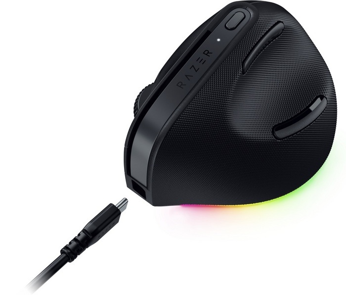 Razer Pro Click V2 Vertical. Format: Droitier, Conception verticale. Technologie de détecteur de mouvement: Optique, Interface de l'appareil: RF Wireless + Bluetooth + USB Type-C, Résolution en mouvement: 30000 DPI, Type de boutons: Boutons poussoirs, Quantité de boutons programmables: 6, Type Scroll: Roue, Accélération (max): 40 G. Couleur de l'éclairage: Multi. Source d'alimentation: Batteries/Câble. Couleur du produit: Noir